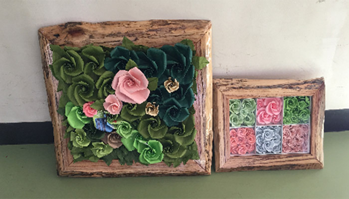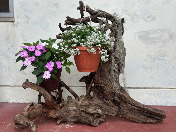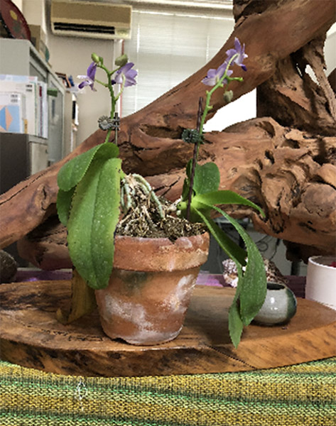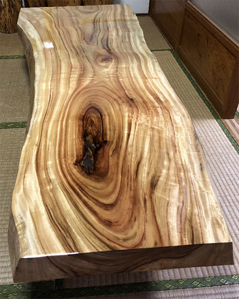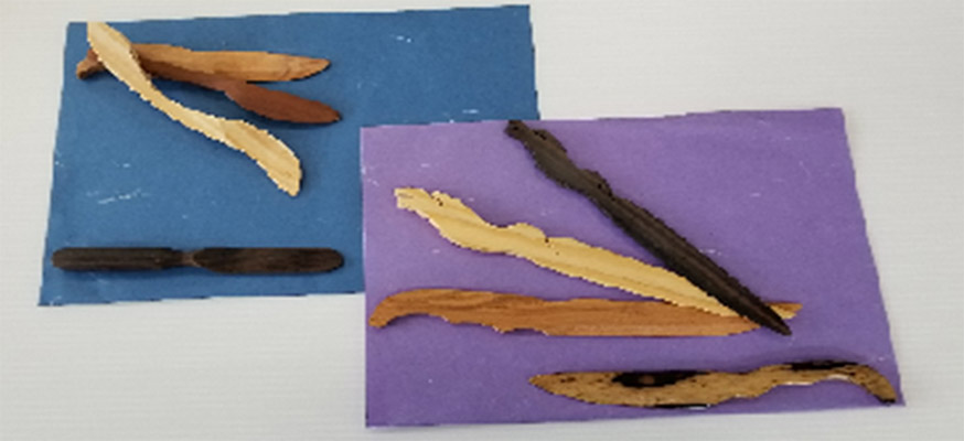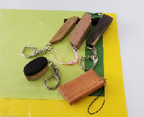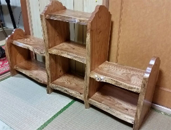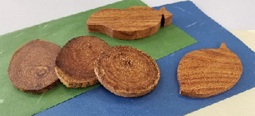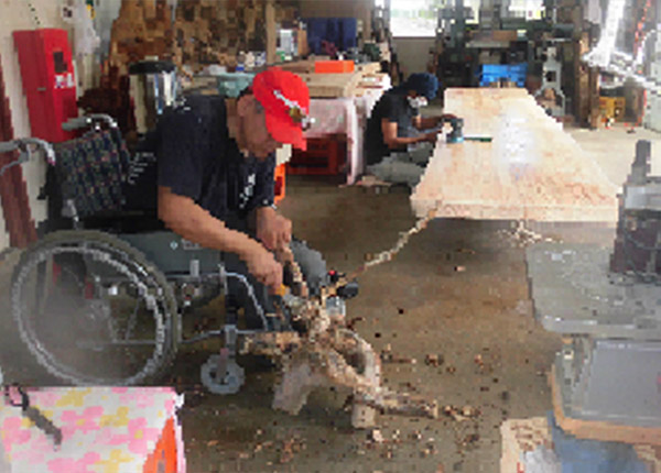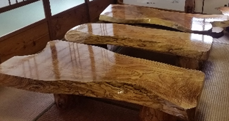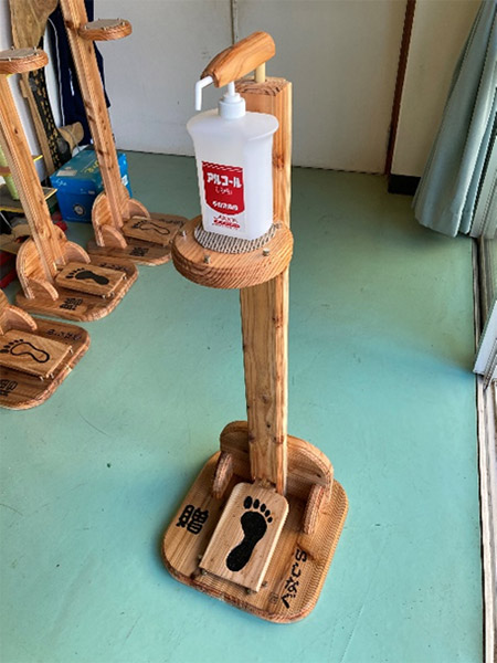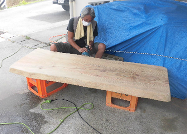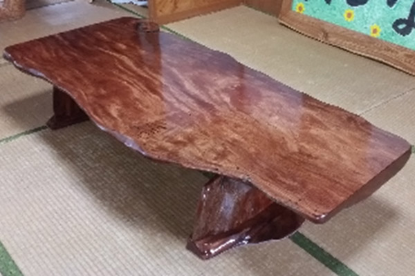 テリハボクやセンダン、クスノキ、蔡温松、流木を使った花台や足踏み式消毒液ホルダー、バターナイフ、ペーパーナイフ、バレッタ、キーホルダー、コースター、茶器台、額や写真立を作成しています。